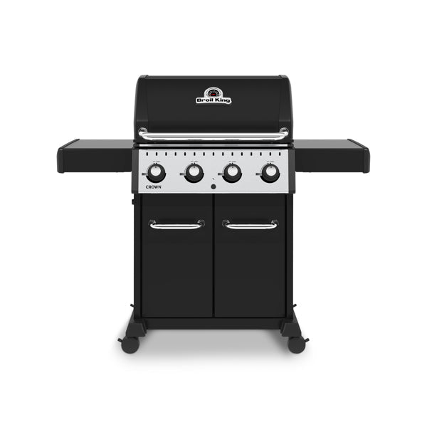 The Broil King® Crown™ 400 Series features 460 sq. in. primary cooking surface and includes a durable cast aluminum oven, 4 stainless steel Dual-Tube™ burners, stainless steel Flav-R-Wave™ cooking system, and electronic ignition. All Crown 400 series include heavy-duty 3-position cast iron cooking grids, black drop-down side shelves and enclosed black cabinet base.