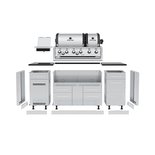 The Broil King® Imperial™ S 690i features two totally independent ovens with a total of 750 sq. in. of primary cooking surface and includes 6 stainless steel Dual-Tube™ burners, built-in oven lights, illuminated control knobs, 6 professional cast stainless steel cooking grids, stainless steel warming rack, stainless steel Flav-R-Wave™ cooking system, and electronic ignition. The S 690i features 304 stainless steel utility cabinet drawers with tank holder (LP) and granite counter top.