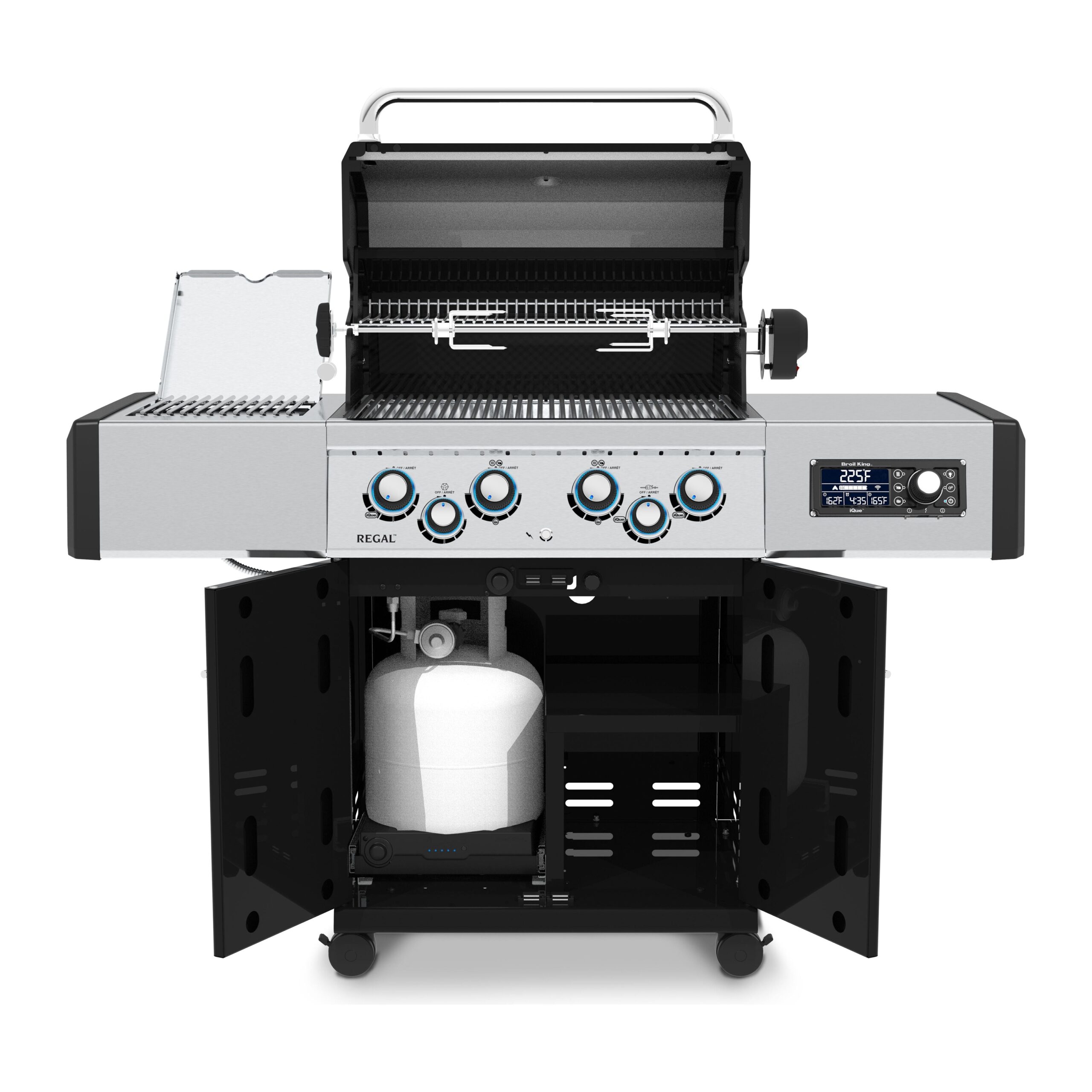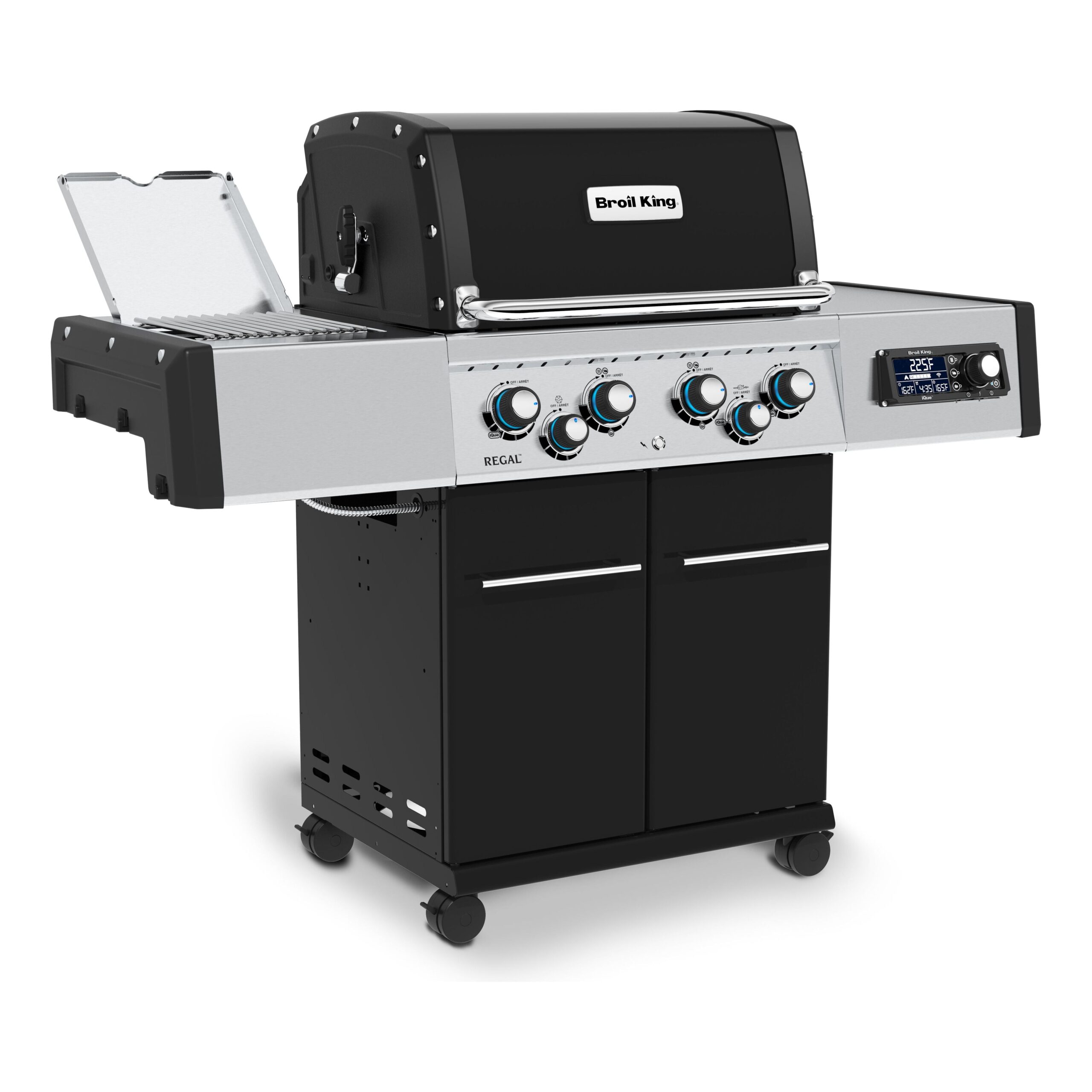 The Regal™ Q 490 Pro IR with iQue™ Technology  features 500 sq. in. total cooking space including the stainless steel warming rack, solid 9mm stainless steel cooking grids, stainless steel Flav-R-Wave™ cooking system, 4 stainless steel Dual-Tube™ burners, stainless steel side shelves, illuminated control knobs, and an enclosed cabinet base. The powerful infrared side burner has a solid 9 mm stainless steel cooking grid and aluminum body.