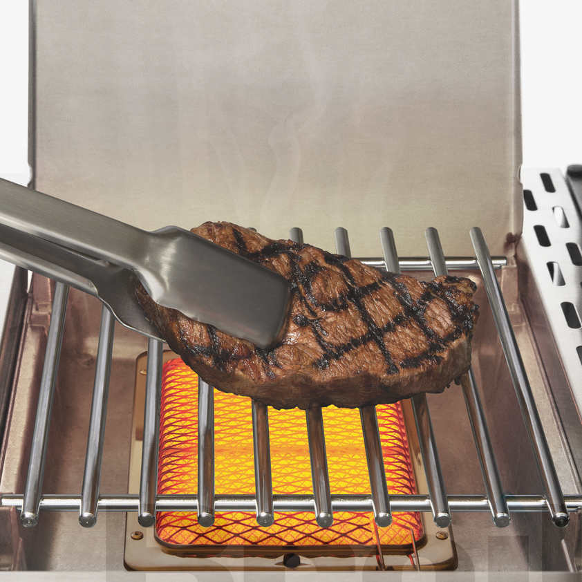 The Broil King® Regal™ S 490 PRO IR features 500 sq. in. primary cooking surface and includes 4 stainless steel Dual-Tube™ burners, illuminated control knobs, handle light, solid stainless steel 9 mm rod cooking grids, stainless steel warming rack, stainless steel Flav-R-Wave™ cooking system, and electronic ignition. The S 490 PRO IR features a powerful infrared burner with solid stainless steel 8mm rod cooking grid, stainless steel side shelves, and an enclosed black cabinet base.