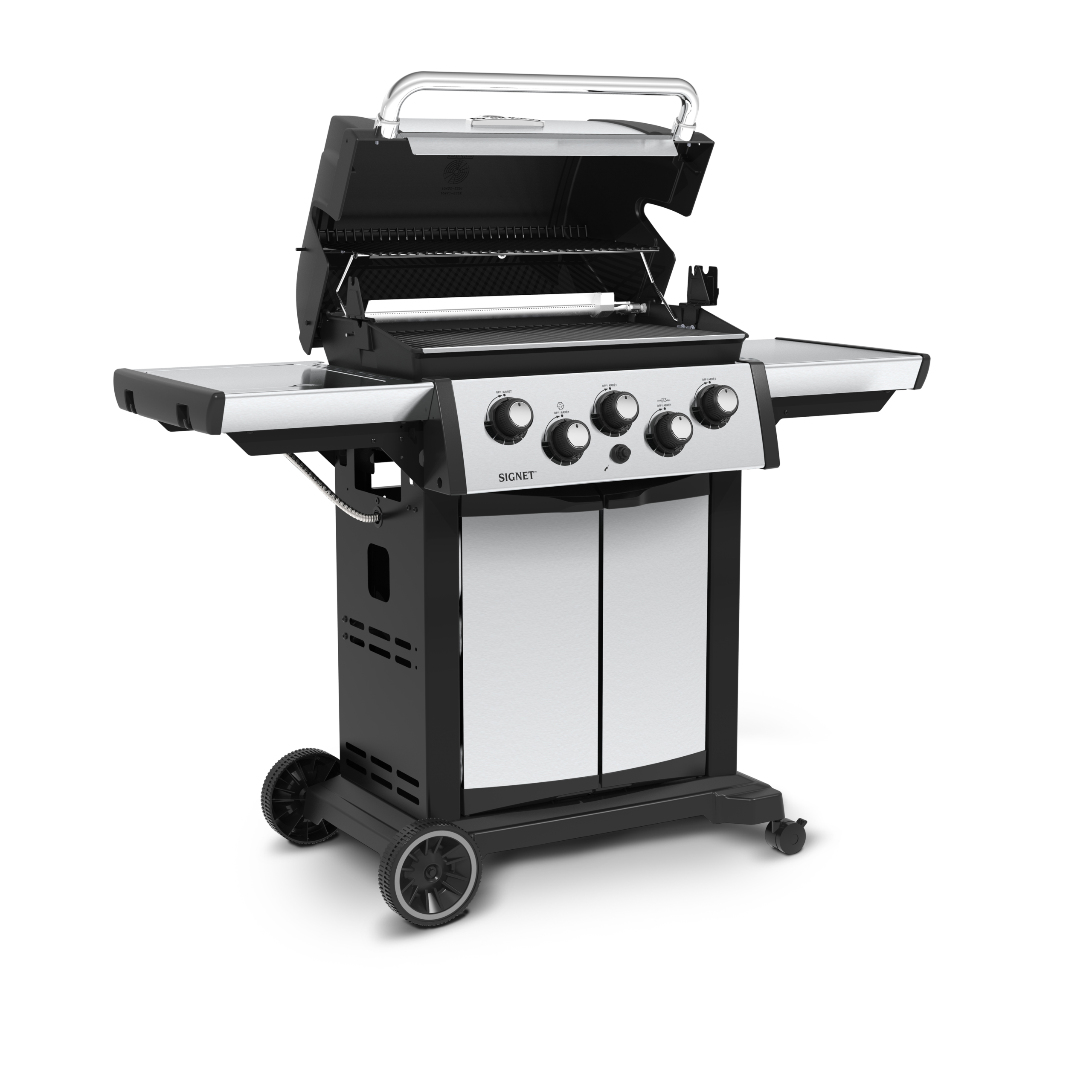 The Signet™ Series features 400 sq. in. primary cooking surface and includes 3 stainless steel Dual-Tube™ burners, reversible heavy-duty cast iron cooking grids, stainless steel Flav-R-Wave™ cooking system, and electronic ignition. The Signet™ series features drop down side shelves and fully enclosed cabinet base