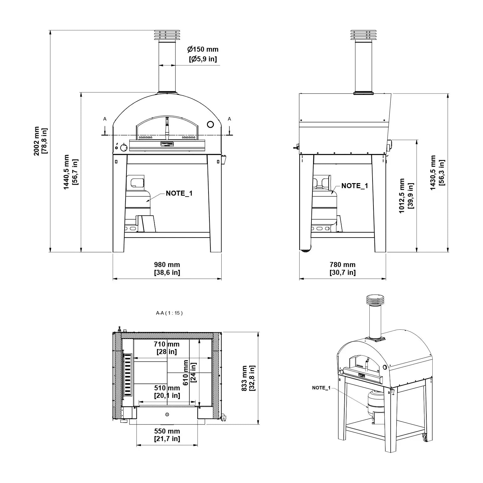 • External Dimensions: 33″D, 39″W, 26″H (+47″ H with chimney)