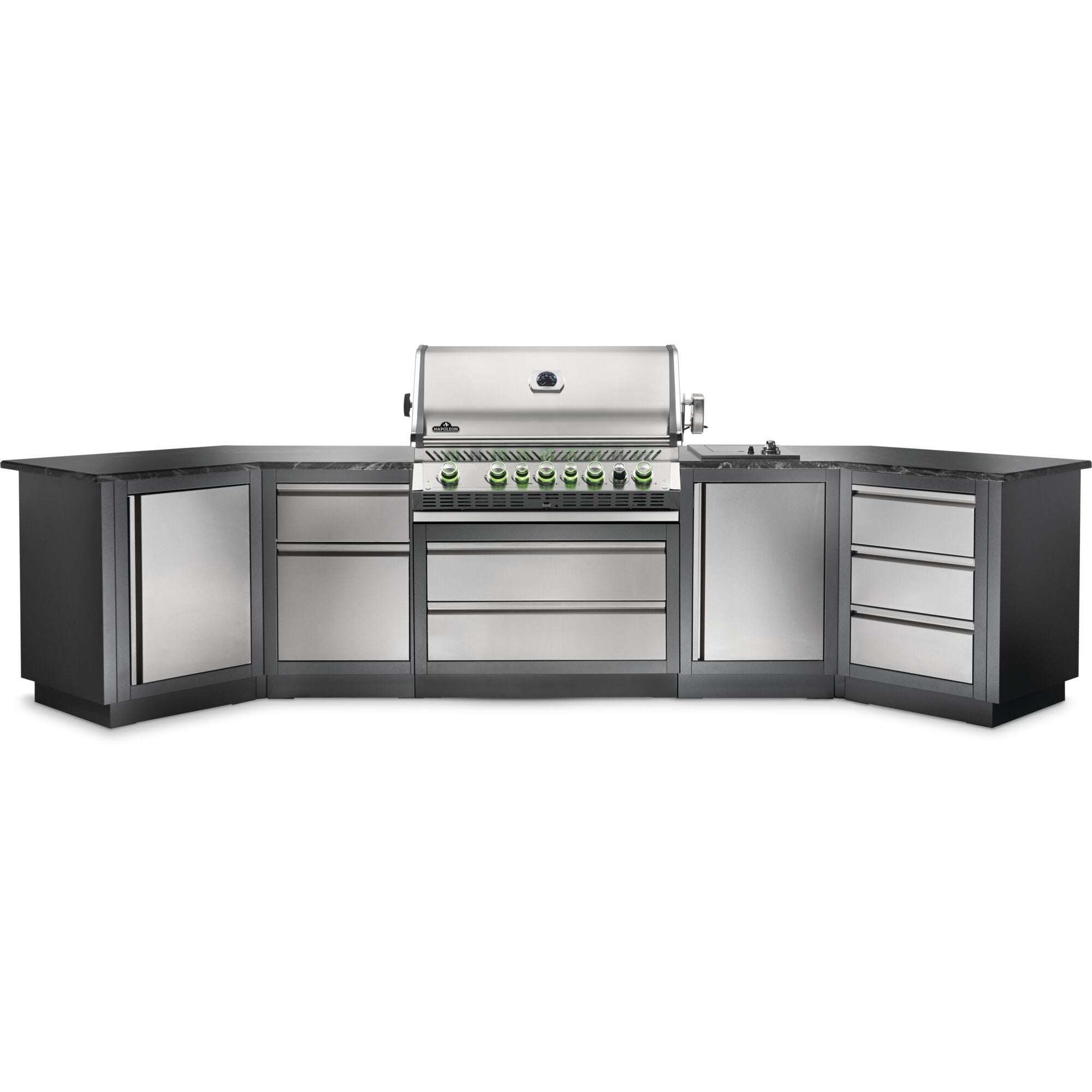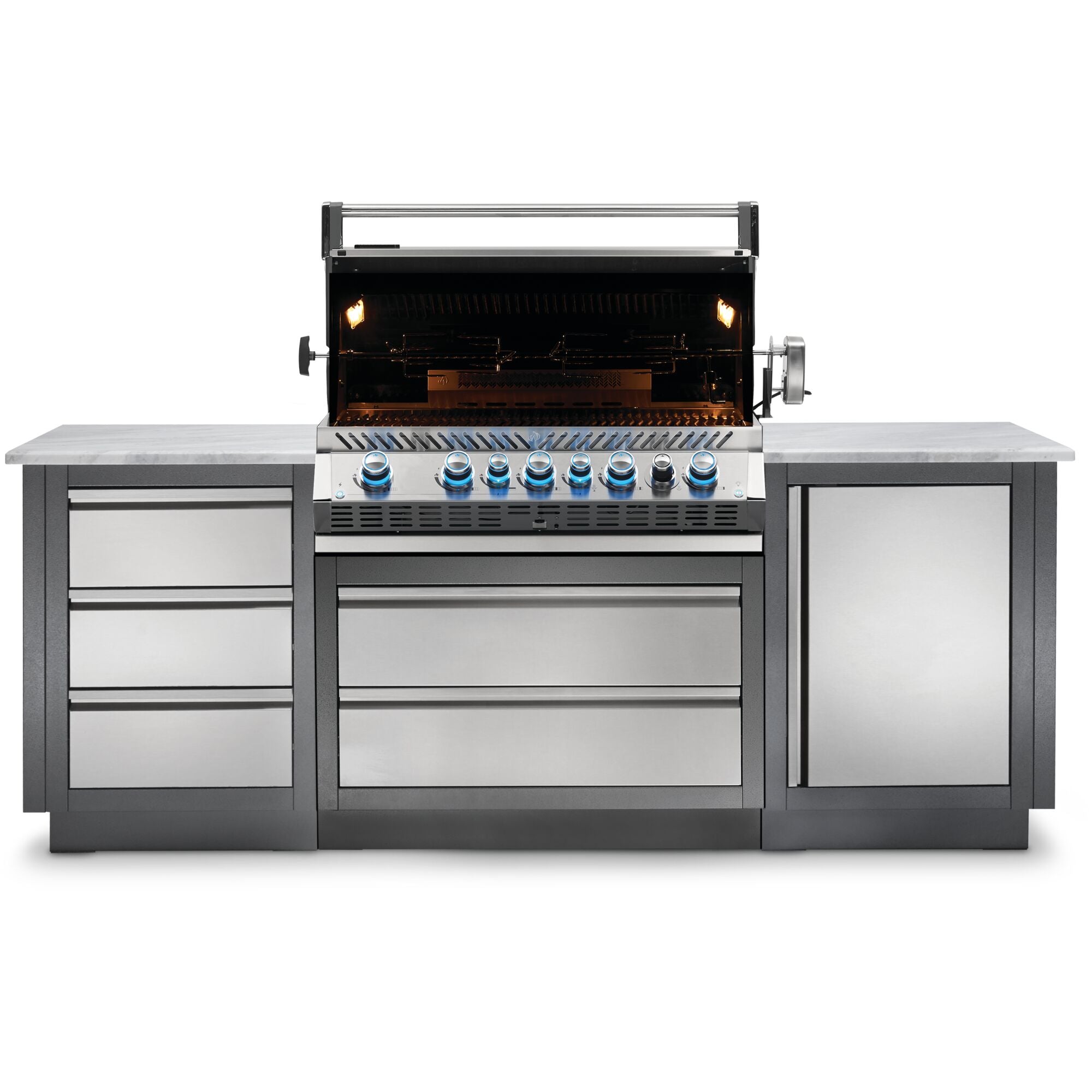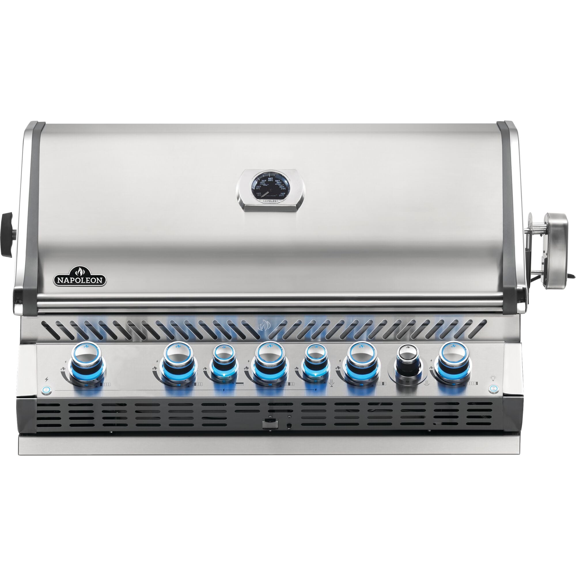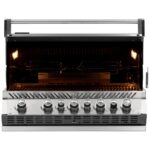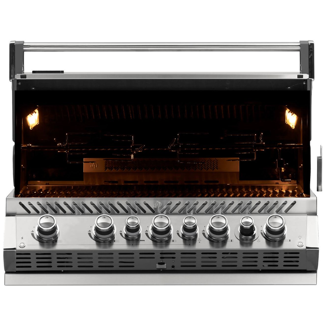 The Built-in Prestige PRO™ 665 Propane Gas Grill with Infrared Rear Burner features seven burners of grilling bliss. Durable stainless steel features chrome accents for luxury and durability. Grill after dark with LED Spectrum NIGHT LIGHT™ Control Knobs, with near limitless color possibilities. Additionally the SafetyGlow feature turns the lights red when a burner is in use. Know which burners are lit so you can get the perfect sear, or ideal indirect grilling temperature. The oven-like performance of this grill allows you to bake and roast with ease, sear over high heat, and the rear burner makes delicious rotisserie meals in no time. You’ll know it’s a Napoleon with the iconic WAVE™ cooking grids and proximity lighting. The integrated smoker tube and dedicated burner can even turn this grill into a smoker, while interior lights let you grill well past dark. Perfect and professional, the PRO™ 665 Built-in Grill Head is the perfect grill for your outdoor kitchen backed by Napoleon’s limited lifetime warranty.