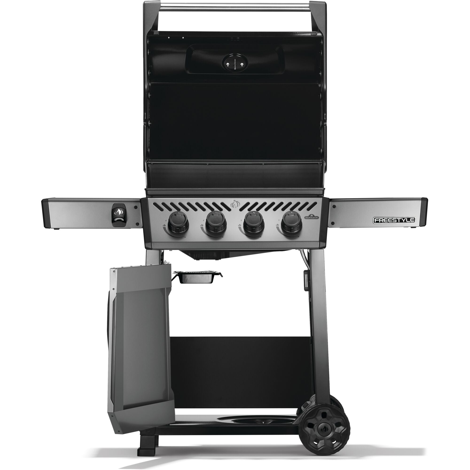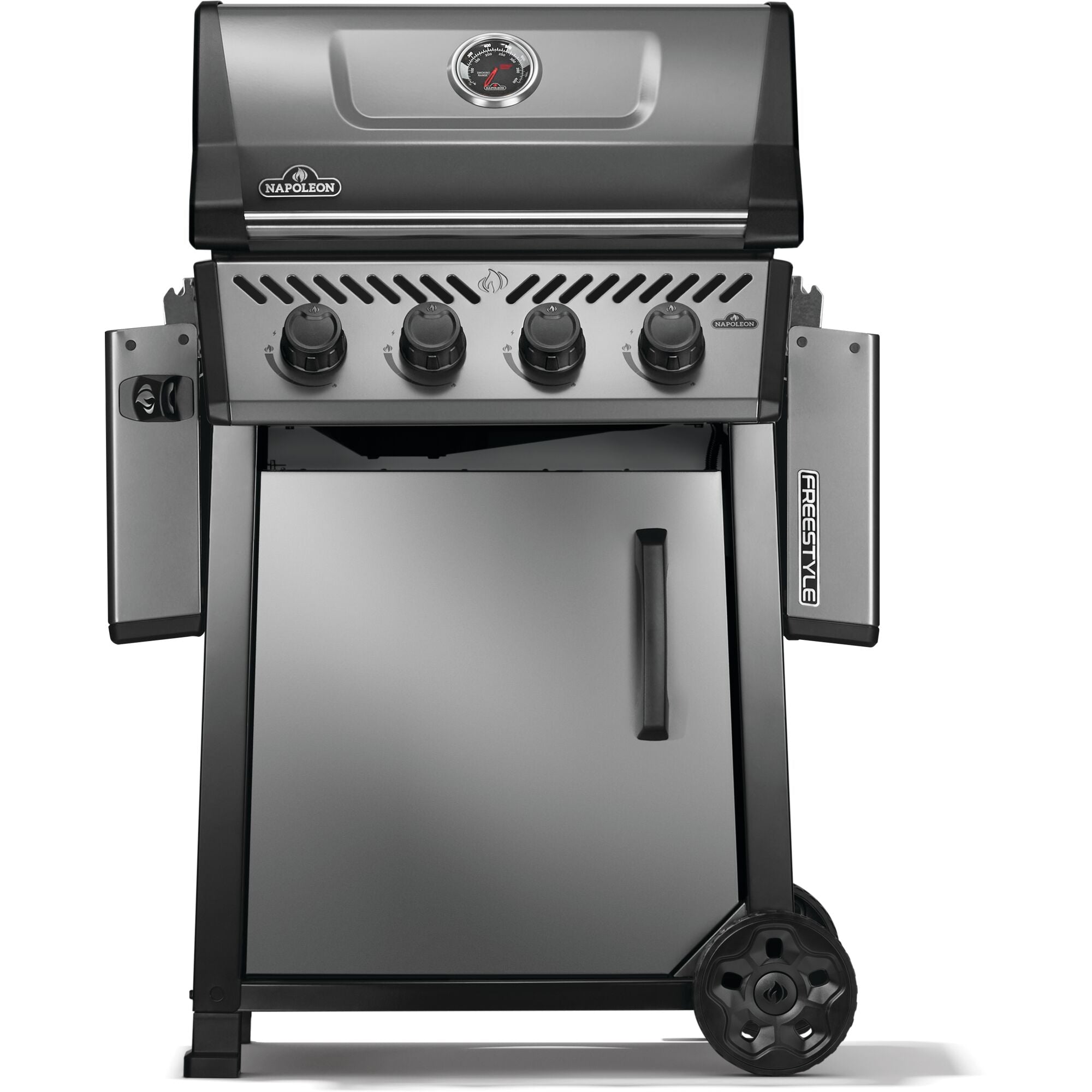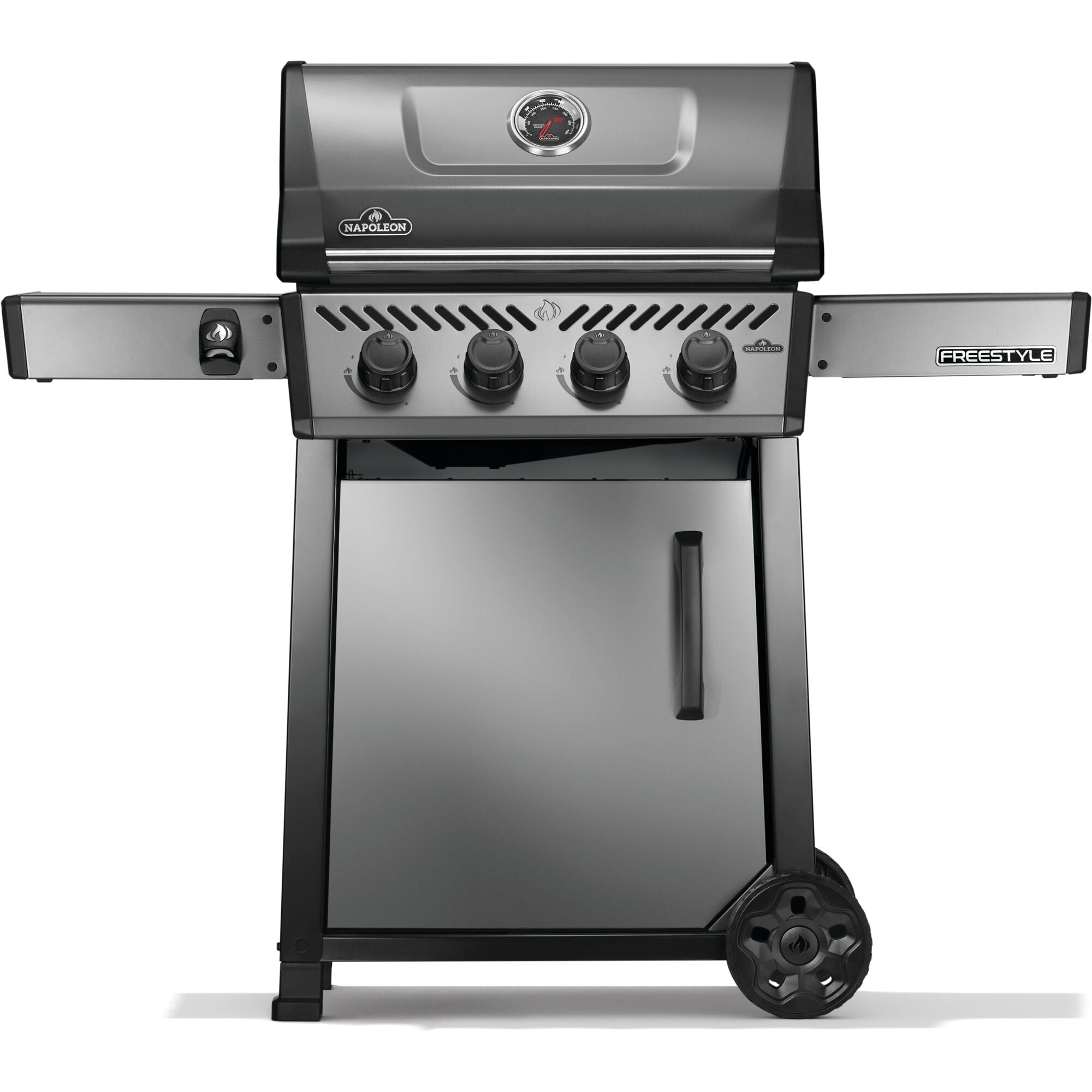 The Freestyle 425 Propane Gas Barbecue is a compact grill with premium features and unbeatable value. Perfect for those who don’t want to sacrifice performance for space! Ignited by the instant JETFIRE ignition system that lights the main burners with a jet of flame easily, every time. Get the perfect sear over the cast iron porcelainized enamel cooking grids. Four stainless steel burners provide heat that can be easily controlled by ergonomic knobs and monitored by the onboard temperature gauge. Add an optional rotisserie kit, griddle insert, or smoker box for even more cooking possibilities. The rugged wheels allow this barbecue to go where the action is, while the easy-to-fold side shelves, featuring tool hangers and a bottle opener, make sure that the Freestyle meets your lifestyle and space all backed by Napoleon’s industry leading 10 year warranty.