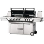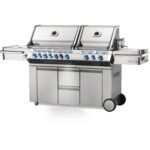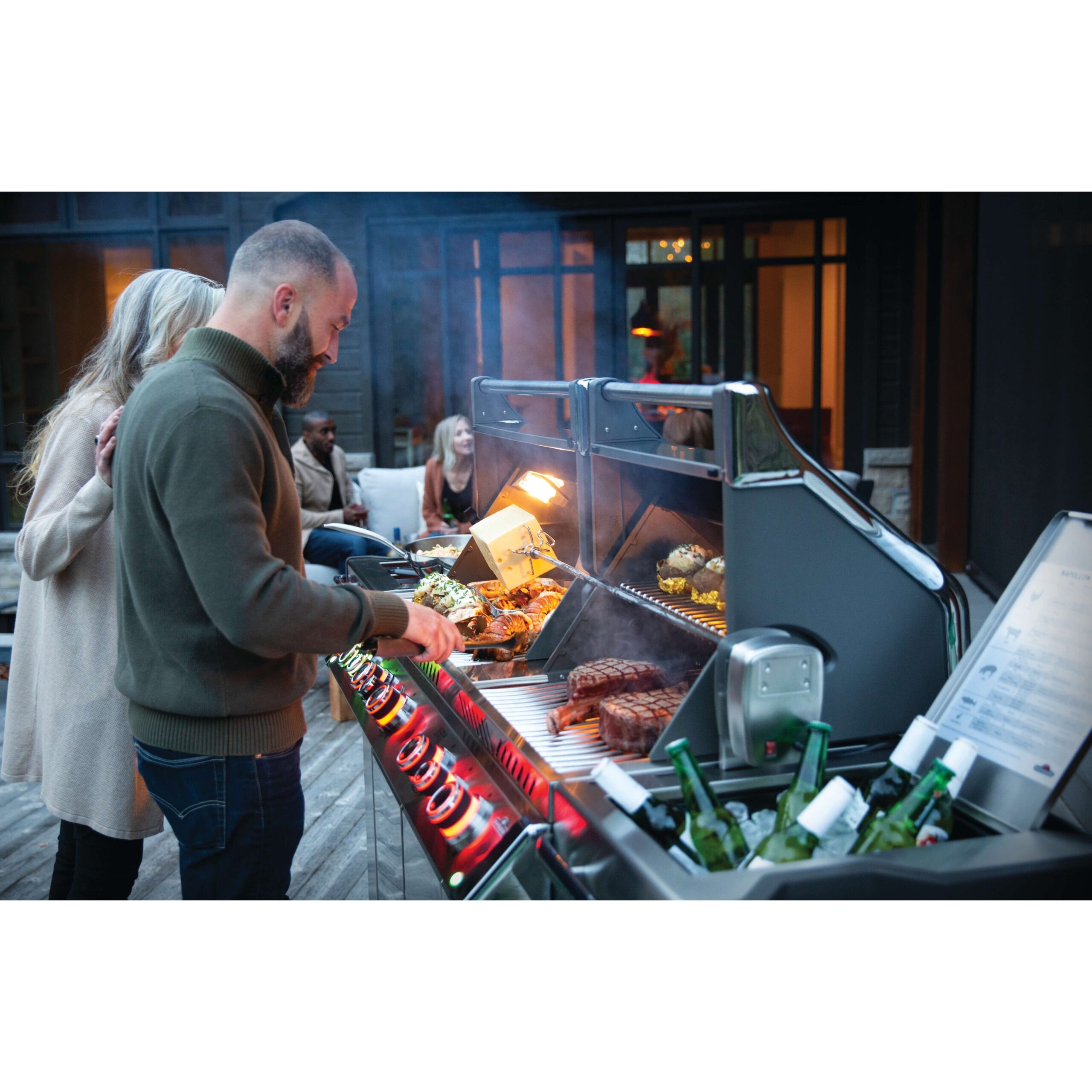 Napoleon’s Prestige PRO™ 825 Propane Gas Grill with a Power Side Burner and Infrared Rear and Bottom Burners proves that two heads are better than one. On the outside, a shining stainless steel body provides durability against the elements while chrome details add luxury. The LED Spectrum NIGHT LIGHT™ Control Knobs have near limitless color options making night-time entertaining a breeze; they also glow red when the gas is left on as a safety feature. You’ll know it’s a Napoleon with the iconic WAVE™ cooking grids for those distinctive sear marks. The main grill head is big enough to grill for a crowd and provides loads of gas powered cooking, including turning your grill into a smoker with the integrated smoker tray and dedicated burner. The second head features two ceramic infrared burners that reach high heat in seconds, ideal for searing restaurant quality steaks. It also features a warming burner so your food always stays the perfect temperature. The Prestige PRO™ 825 also has a two-stage power side burner with a reversible cooking grid ideal for sauces, sautes and side dishes. Enjoy evenly cooked restaurant style meals with the rear infrared burners and rotisserie.