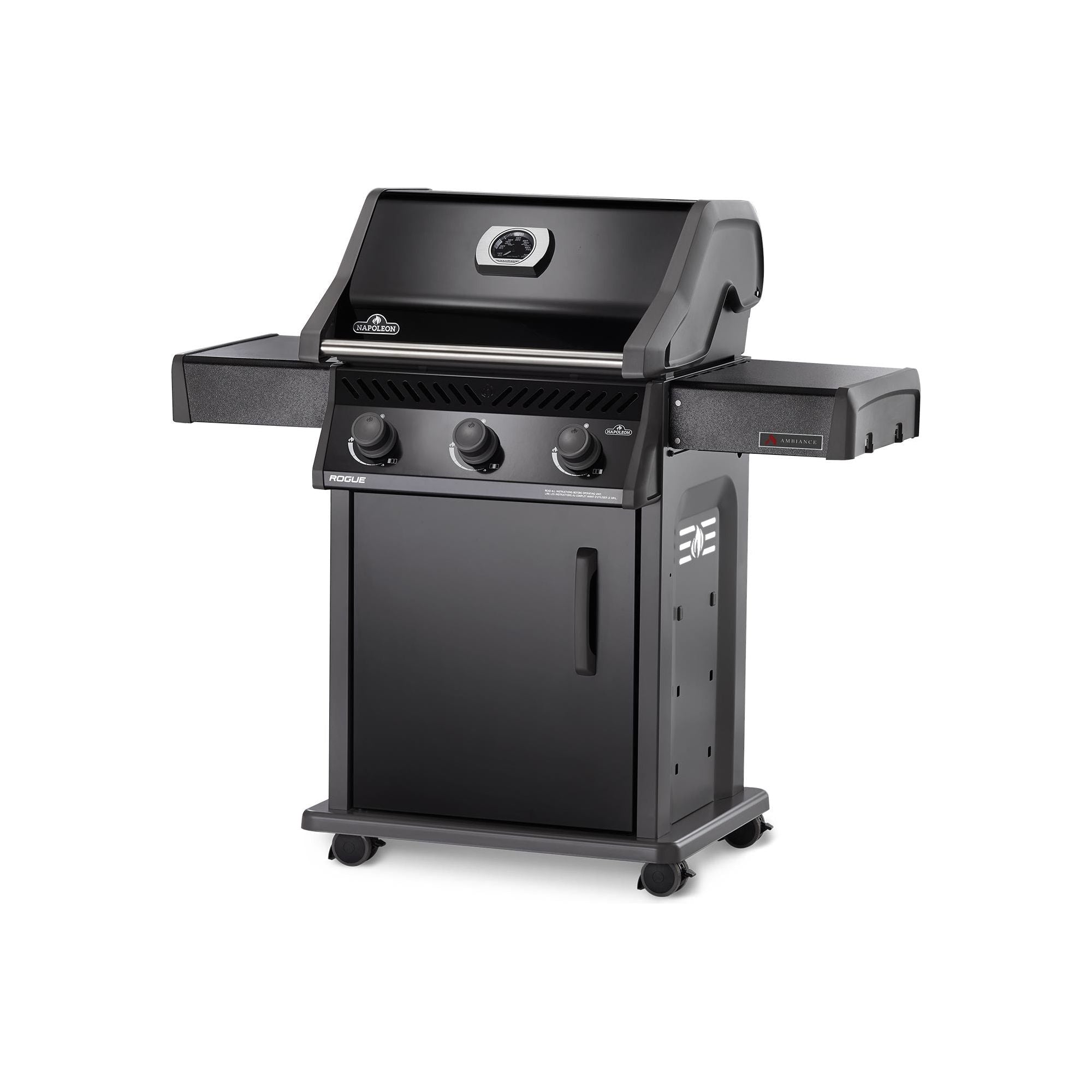 Elevate your grilling experience with the Ambiance® 425 Gas Grill by Napoleon, a culinary masterpiece boasting distinctive upgrades that set it apart from the rest. Picture this – sleek black folding shelves providing a surface that not only enhances aesthetics but also prevents unsightly scratches. An expansive door invites you to effortless access the dripping pan and propane tank, adding a touch of convenience to your cooking routine. The upgraded knobs and thermometer aren’t just functional; they’re designed to make your grilling endeavors a joy.