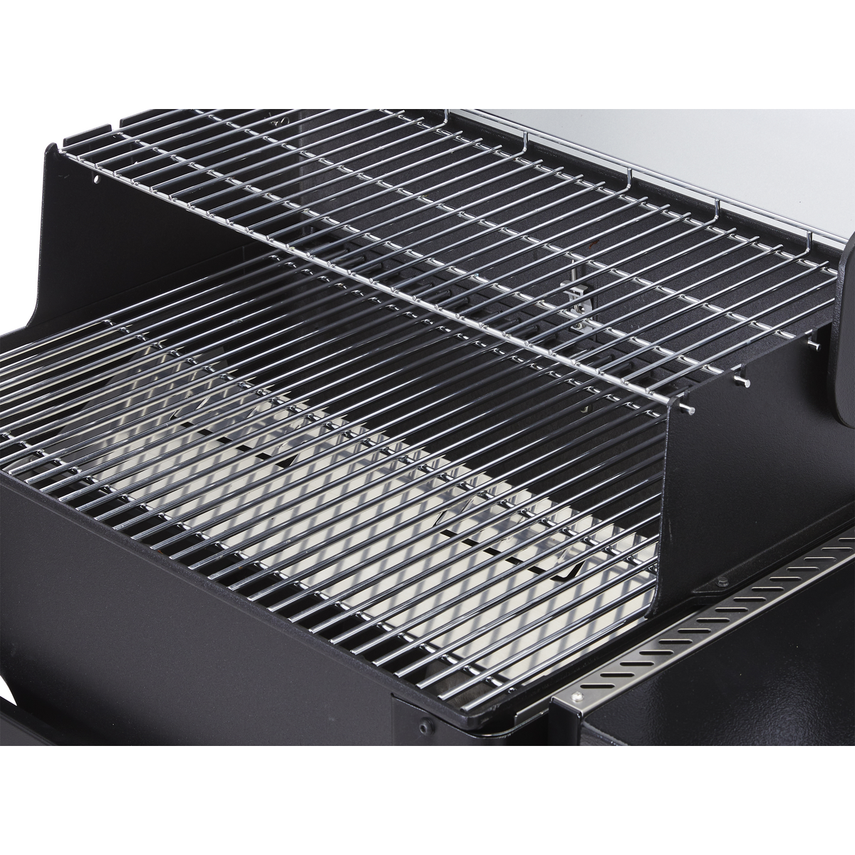 - Dual grilling space = 972 sq in • Bottom grate 630 sq in, Top grate 342 sq in